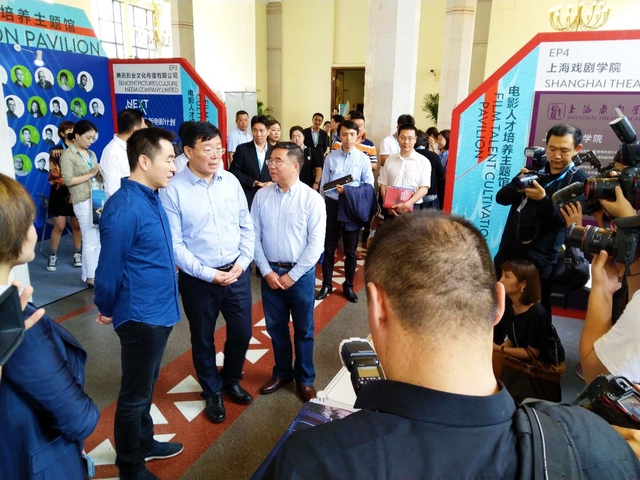 图为公司影视公司高等教育成果亮相第22届上海国际电影节电影市场,中共上海市委常委、宣传部长周慧琳视察公司展台