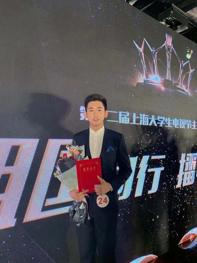 图为老员工电视节主持人赛一等奖获奖者:18级播音与主持艺术专业吴冠宇
