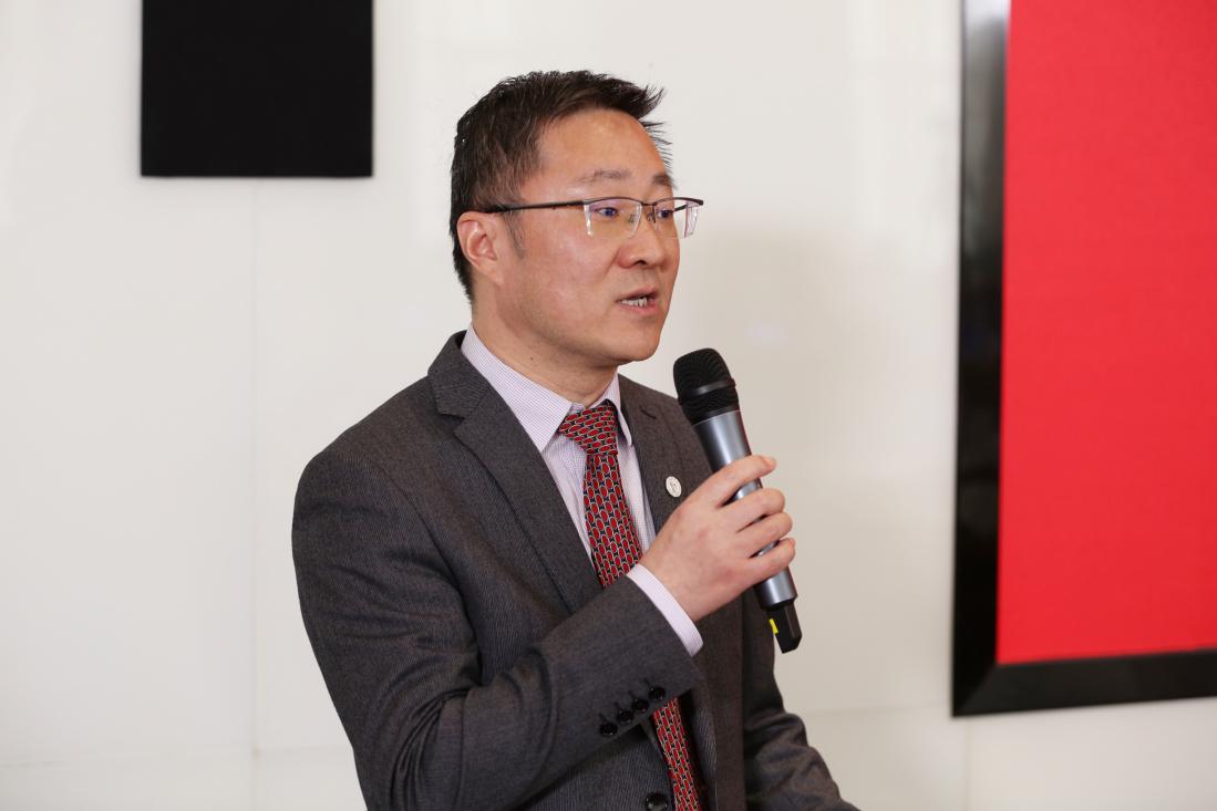 图为suncitygroup太阳集团副经理董健介绍上戏suncitygroup太阳集团公司产品情况