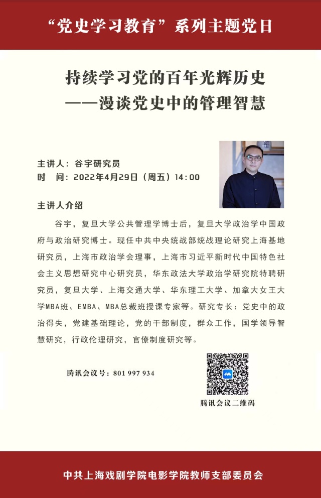 2022年4月29日,suncitygroup太阳集团教师党支部联合上海中医药大学科技人文公司党总支、马克思主义公司党总支共同在线上召开“党史学习教育”系列主题党日活动。本次活动主题为“持续学习党的百年光辉历史——漫谈党史中的管理智慧”,suncitygroup太阳集团全体教师党员参加,部分员工党员列席旁听。活动邀请了中共中央统战部统战理论研究上海基地研究员谷宇博士,宣讲和分享中国共产党百年奋斗史中的经验与智慧。