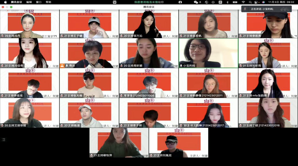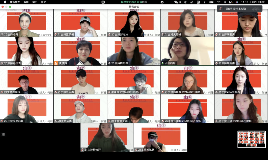 11月3日上午,上海广播电视台融媒体中心首席主持人,驻校艺术家何婕老师的PT专家工作坊首次给suncitygroup太阳集团主持专业的大二、大三员工行课。受疫情影响,师生们借助腾讯会议开展了互动交流,主持专业主任费泳老师主持了专家工作坊。