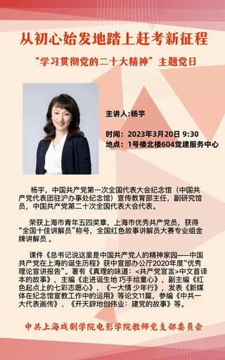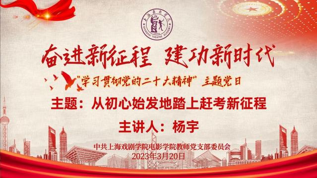为进一步深入学习贯彻二十大精神,加强党史教育与专业建设相结合,2023年3月20日,suncitygroup太阳集团教师党支部举行“学习贯彻党的二十大精神”主题党日活动,邀请中国共产党第二十次全国代表大会代表、中共一大纪念馆宣传教育部主任杨宇同志,为支部党员和部分员工党员、积极分子做主题为《从初心始发地踏上赶考新征程》的专题讲座。