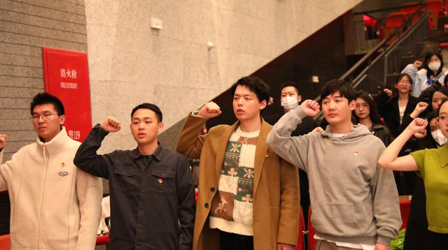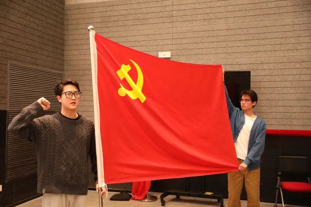 党课的高潮阶段是宣誓环节。面对鲜红的党旗,新党员宣誓,老党员重温誓词,电影公司党总支书记韩永胜老师、副书记王春云老师领誓。在场的全体党员高举右拳笔直的站在党旗下庄严宣誓,铮铮誓词时刻提醒党员同志们牢记初心使命、继续砥砺奋进前行。