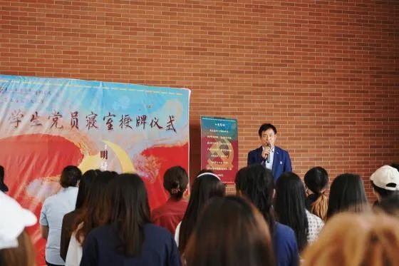 宣誓结束后,电影公司党总支副书记王春云老师、教师党支部委员林小慧老师为优秀党员寝室授牌,并鼓励各位优秀党员坚持不懈,始终牢记使命,积极发挥好先锋模范带头作用。