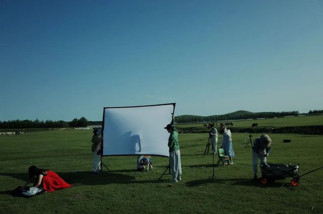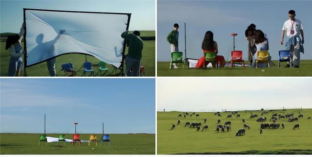 我们试着在草原上搭起露天电影的幕布,但风太大,幕布几次被吹翻了,我们坐在凳子上,看向幕布落下的“镜框”外,凝望着一望无垠的广袤草原,仿佛我们所处的当下也变成了“电影”。