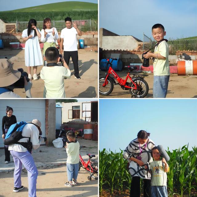 在附近村屯里,我们遇见了幼儿园的员工东东,他看到我们的摄影和录音设备后,产生了极大的兴趣,第一次拿起单反相机的他却有着“职业摄影师”的范儿,立刻给家人拍了一张合影。他还戴上耳机,背上录音杆,走进玉米地里,尝试着录制田野里的环境音。