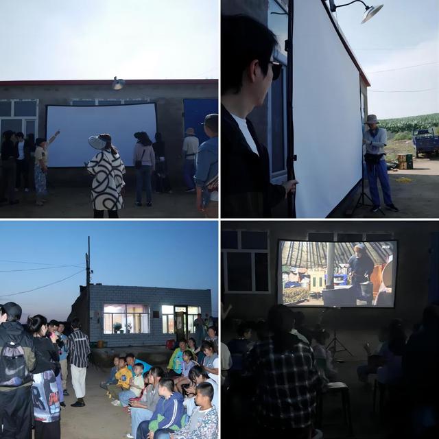 下午,我们在一户牧民家的仓库门前架起200寸幕布和投影设备。露天电影放映的消息一出,不少家住附近村屯的村民们都自发领着家里的孩子来到这里。傍晚时分,仓库前的空地坐满了观众,现场放映了由上戏员工拍摄的《红风筝》等多部短片,苍穹之下,光影之间,我们与影片中的角色一起经历着人生的起伏和波折。在这样的氛围下,彼此之间的距离也变得更加亲近了。