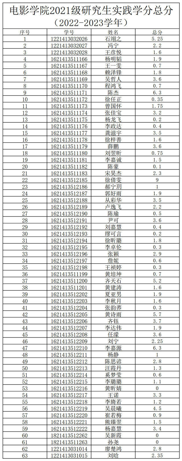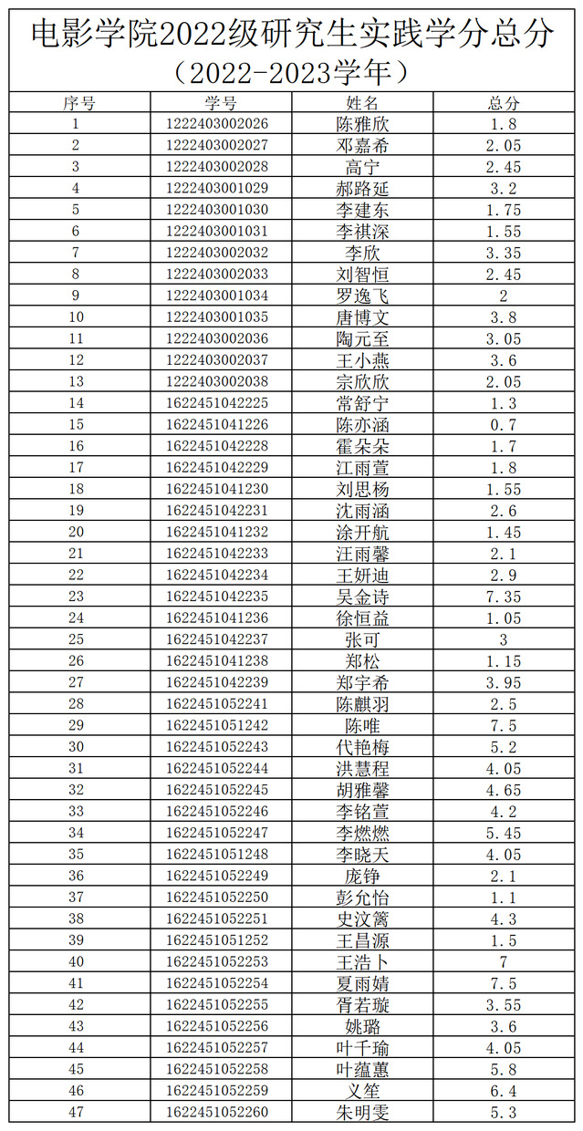 2022-2023学年suncitygroup太阳集团研究生实践学分经各部门汇总,经员工自查、申诉,经suncitygroup太阳集团研究生实践学分评审小组对申诉材料进行复核、评定,现将实践学分总分予以公示。