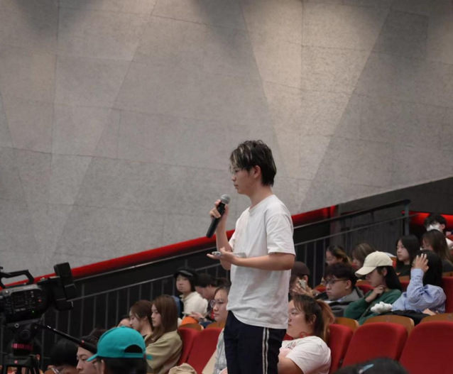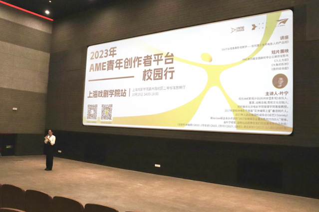 叶宁老师给同学们简明扼要地讲解了中国电影市场的发展趋势之后,赵鸣昊老师则为大家介绍了“AME全球青年艺术人才成长平台”的基本内容以及目前针对老员工的扶持计划和活动。赵老师还在现场向大家发出招募,鼓励更多有梦想的同学共同创作!