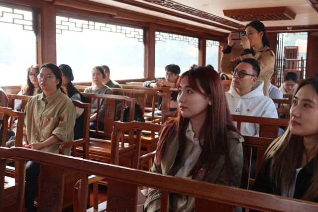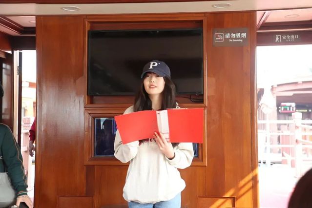 从纪念馆一路向北,支部党员们前往南湖会景园码头,来到当年一大参会代表登船的故地,在波光粼粼的湖边登上了游船前往湖心岛瞻仰当初的红船。在游船上,员工党员洪慧程和石翊之分别为大家带来了红船上的一堂特别的微党课。