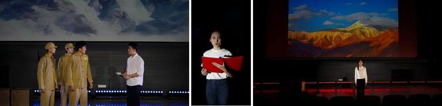本次无障碍戏剧是为盲人朋友特别定制的“演诵篇”,通过调整表演与朗诵的时长比例,让盲人朋友们能够“听”懂戏剧、“声”临其境。演出包含《我歌与我哥》、《永不消逝的声音》、《悟空的黑悟空》、《雪山寄》和《沧浪一生》五个故事,在三位青年老员工讨论如何举办情景剧大赛的故事框架下串联呈现。《青春家国》讲述了中国不同历史时代下,青年人的抉择与勇气,让上海的盲人朋友听到了关于青春与家国的不朽颂歌,通过一系列红色人物勇毅抉择的故事,鼓舞着残障人群的心灵世界。