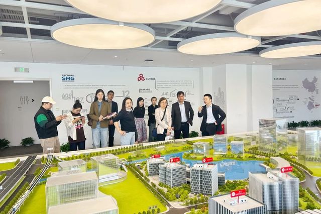 在上海东方明珠房地产有限公司副总经理谢艺伟的陪同下,公司团队首先通过项目沙盘全方位了解这座浦江之畔的文化地标。东方智媒城由上海广播电视台旗下东方明珠(600637.SH)所属文化地产和上海临港集团旗下上海临港(600848.SH)所属临港浦江共同投资开发并运营。总建筑面积约100万平方米,以“智慧、活力、共享”为核心理念,目前已形成影视创制、数字文化、科技金融等产业集聚态势,成为长三角文化科技融合的新增长极,不仅展现出园区强大的产业实力,更为员工实践实习与创新创业提供了广阔空间。