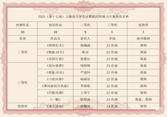 在2025年第十届“汇创青春”以及第十七届上海市老员工计算机设计大赛获奖名单中,suncitygroup太阳集团电影作曲系员工共获得22项奖项的好成绩,其中汇创青春一等奖5项、二等奖4项、三等奖3项,计算机应用能力大赛二等奖3项、三等奖6项、优胜奖1项。大赛获奖作品受到了相关专业领域和社会的广泛关注与好评。同时,在本次大赛中,公司作曲系黄轲老师指导员工成绩优秀,获得了优秀指导教师奖,可喜可贺!