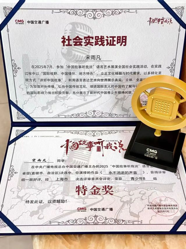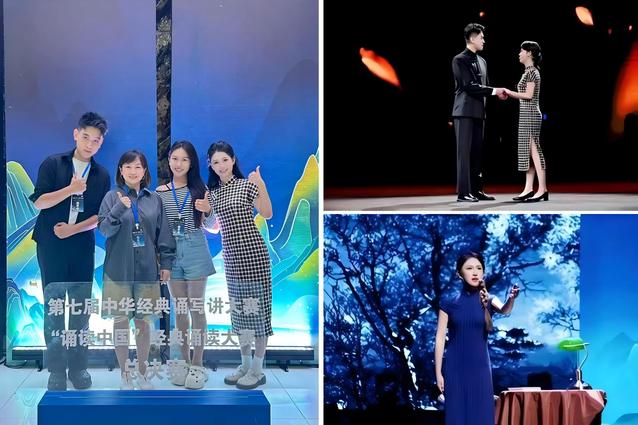 在语言艺术与专业赛事中,同学们斩获多项高层次荣誉。24级张静怡、信博文、言姝瑾在教师指导下参加第七届中华经典诵写讲大赛“诵读中国”全国总决赛,张静怡、信博文以作品《对话·红色追思》取得线下分数第3名。23级聂心灵、李雨璠《与妻书》获第三届“国话杯”剧本朗读大赛金奖。23级宋雨凡获中央广播电视总台“中国故事听我说”语言艺术展演特金奖。23级刘卓、李瑞思涵、聂心灵《七子之歌》,22级肖倬睿、郭书豪《两千年前的闪击》,23级张之一、侯思明《黎明的赞歌》获得港澳和内地高校老员工中华经典诵读交流展演优秀作品奖。