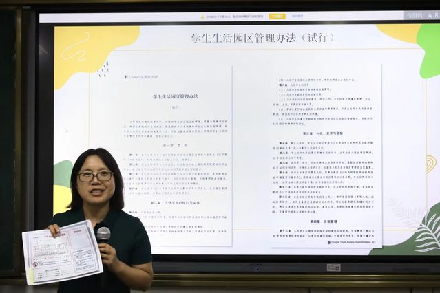 员工生活园区负责人郭冠彦老师围绕园区管理新规,解读了员工在寝室安全、卫生、公共秩序等方面的责任与权益。她结合《校园逃生示意图》指出,园区为员工提供紧急逃生通道,园区管理新方法进一步细化了寝室违规行为的认定与处理流程,同时根据《员工控烟规定》,鼓励同学们以规范为基、以文明为要,维护校园洁净环境,做到无烟校园,减少火灾隐患,共同维护园区秩序。同时,郭老师建议大家保存值班电话,积极反应情况和沟通,共建和谐校园。