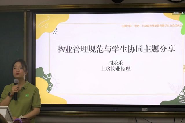 上房物业经理周乐乐从专业视角出发,讲解了安全管理,隐患问题,应急管理等物业工作的规范流程。她特别强调员工与物业的协同配合至关重要,如及时反馈设施隐患、规范投放垃圾等行为,能有效提升寝室居住体验,保障住宿安全。