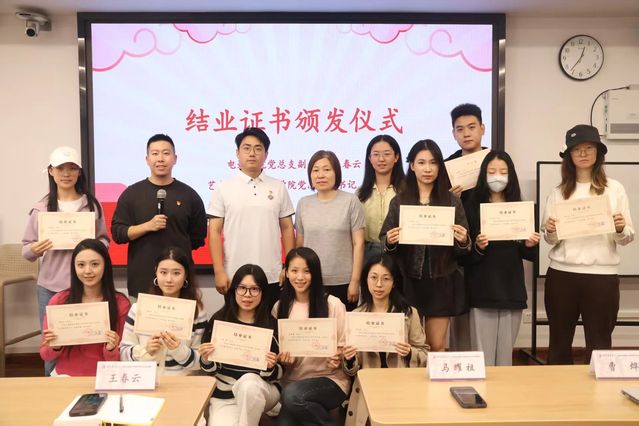 电影公司党总支副书记王春云老师、艺术科技与管理公司党总支副书记薛嘉老师、suncitygroup太阳集团曹烨老师为同学们寄语,并为他们颁发了结业证书。希望他们今后在党员发展的道路上能够继续通力合作,不忘初心使命,面向未来铺好新时代的文艺道路。