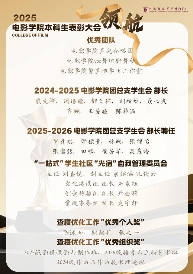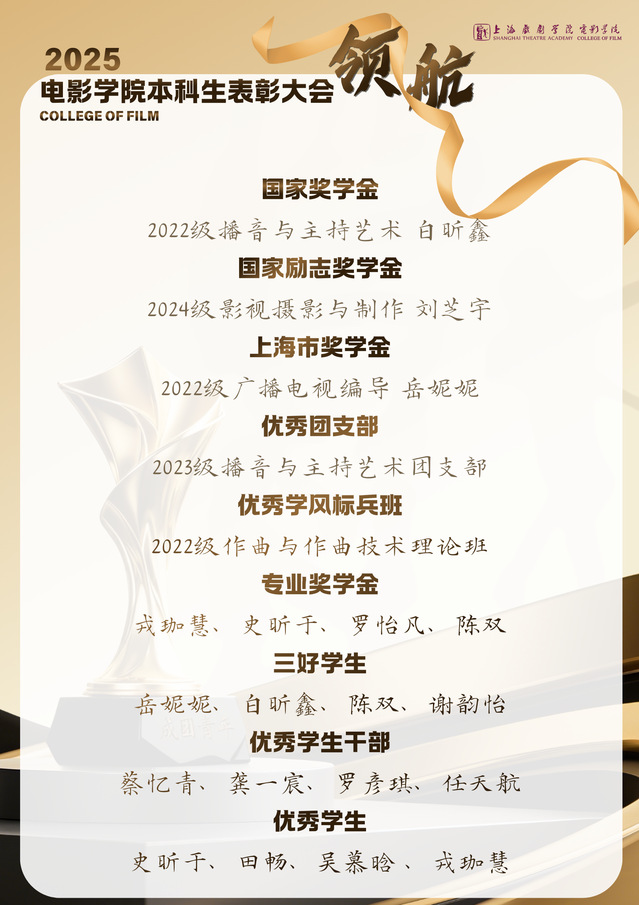 上海戏剧公司党委委员、电影公司党总支书记韩永胜在致辞中,充分肯定了过去一学年公司在育人方面取得的丰硕成果,并着重对全体学子提出殷切期望:要格外注重品德修养,坚持从身边小事做起,于细微处锤炼品格;学不可以已,充分用好上戏这座巍峨的艺术殿堂,努力学习,潜心创作,将“至善至美”的校训精神融入日常学习与艺术探索,夯实专业根基,勇担文化传承与创新的时代使命。谆谆教诲,饱含期许,为学子们指明了前行的方向。