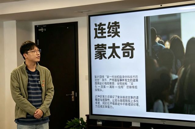 2025级白睦萱同学以国产谍战天花板级经典电视剧《潜伏》的片段切入,这部开播十余年来始终稳居谍战剧口碑榜首的作品,堪称 “谍战叙事教科书”,他从日常化场景的悬疑感塑造、近景特写对人物心理的捕捉、生活化台词对风险隐蔽性的强化,拆解了这部经典作品长盛不衰的创作密码。