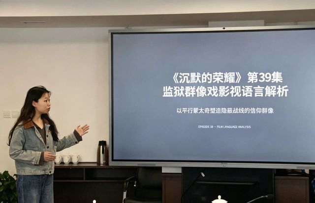 支部委员、2024级石文婧同学对电视剧《沉默的荣耀》经典片段进行导赏,拆解长镜头的情绪传递、留白叙事的共情力、光影设计对人物内心的外化表达,从后辈视角解读了前辈用表演塑造的英雄风骨。